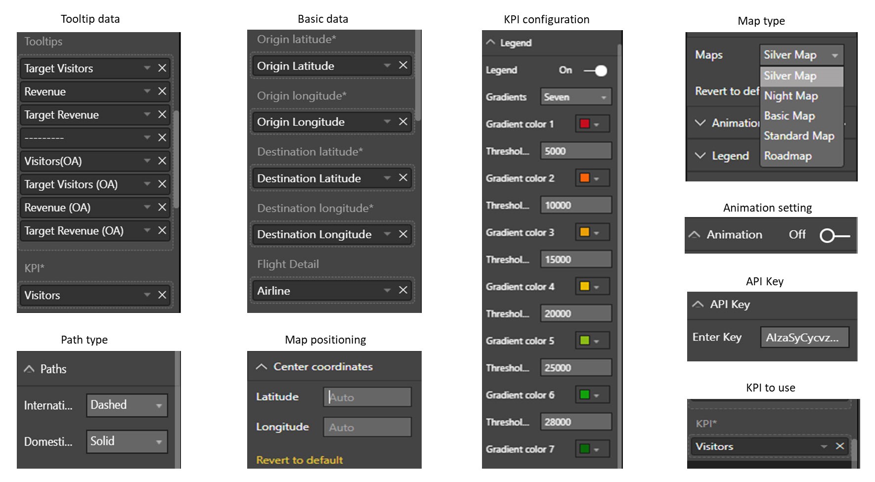 Setup of the visual requires providing the appropriate KPI data. Users can configure which KPI ranges are displayed, assign colors to the ranges, and set solid or dashed lines. As shown below, the visual includes options to customize tooltips, path type, map positioning, map color, and animations.